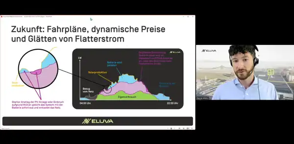 Pascal Mühry von ELUVA erläutert in diesem Vortrag, wie neben der Erhöhung des Eigenverbrauchs auch durch Anbieten von Regelenergie der Batteriespeicher besser genutzt und die Wirtschaftlichkeit verbessert werden kann. Aufgrund der PV-Leistung, welche am Schweizer Stromnetz angeschlossen ist, wird die Vermarktung von Flexibilität immer wichtiger. Dabei gibt es nicht nur die klassische Regelleistung, um Flexibilitäten von Batterien und Solaranlagen zu vermarkten.