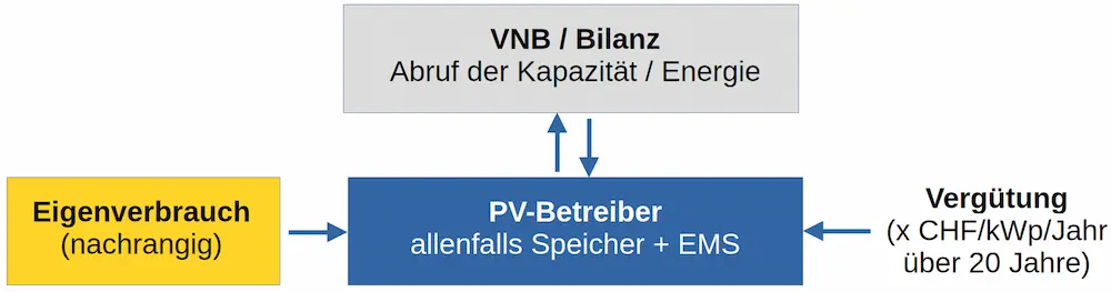 - Modell 4: Smart-Grid-Bonus-System: VNB gibt Echtzeit-Preissignale (Bonus bei Netzbedarf, Malus bei Netzengpass). Führt zur automatischen Selbstregulierung der Netzbelastung